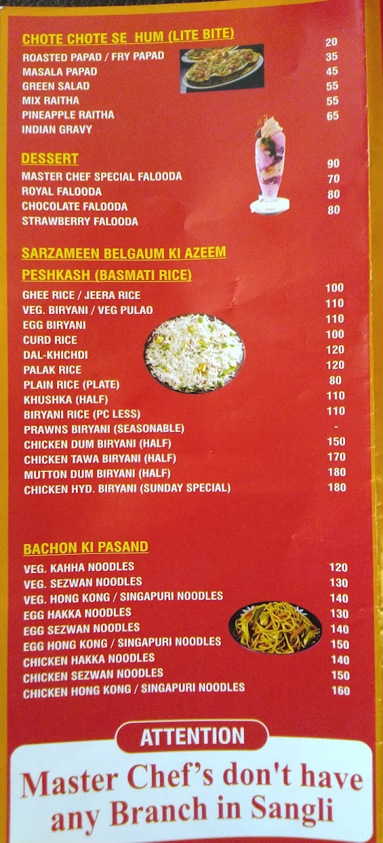 Welcome to Hotel Masterchef's, a culinary gem nestled in Miraj, Maharashtra. This restaurant is not just about food; it’s an experience that tantalizes the senses with its eclectic menu. The offerings range from mouthwatering non-veg starters, including the succulent burra kebab, to a variety of flavorful biryanis, praised for their rich taste.
